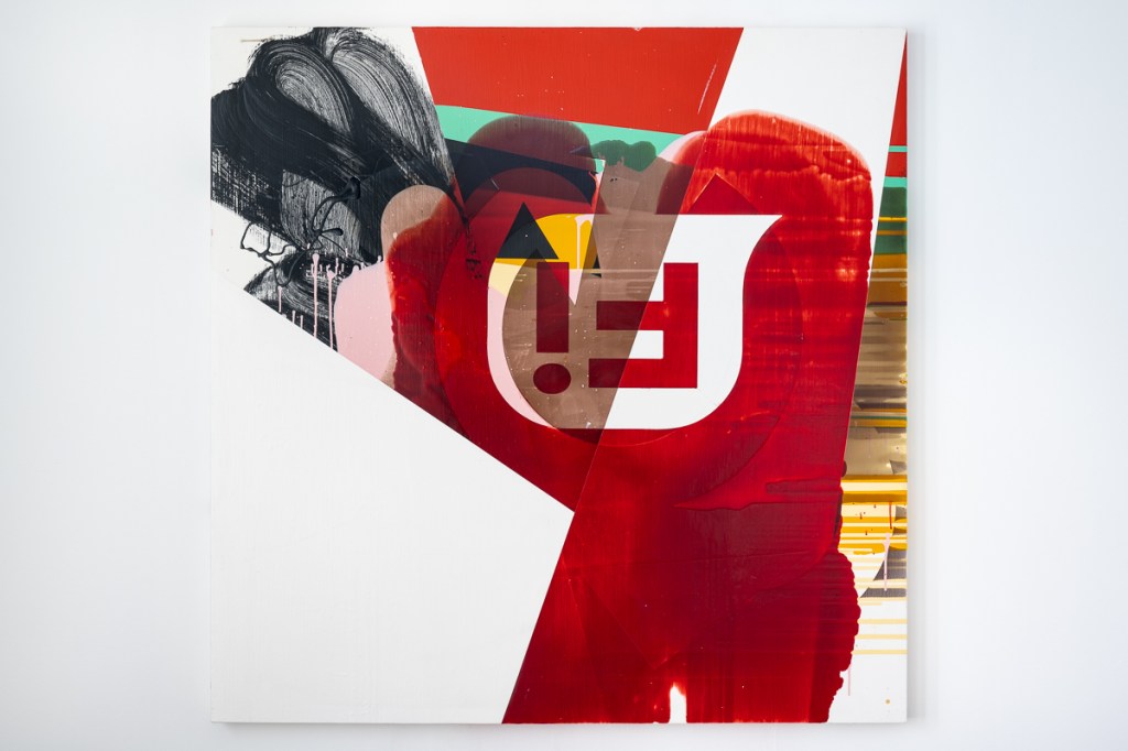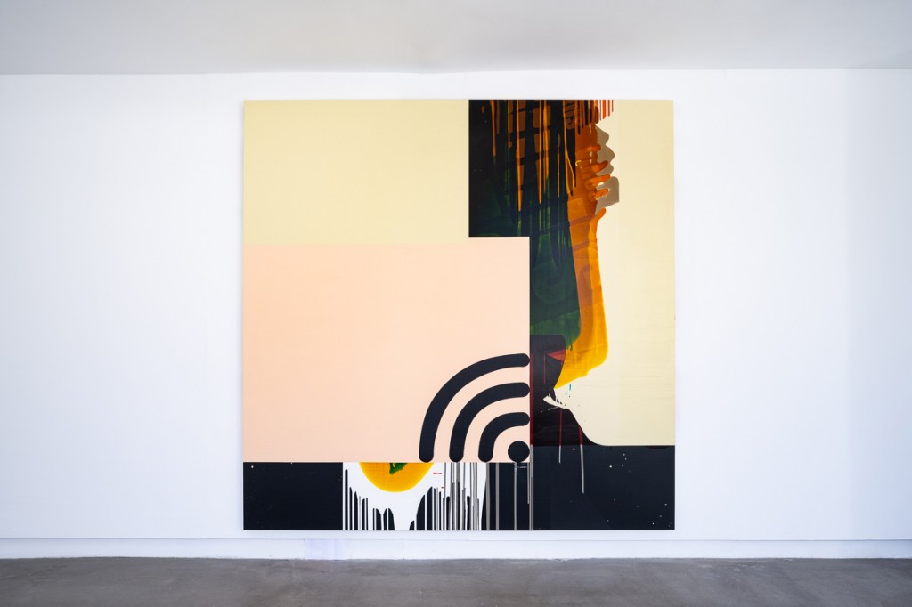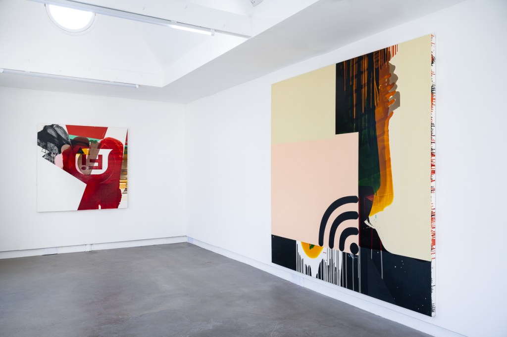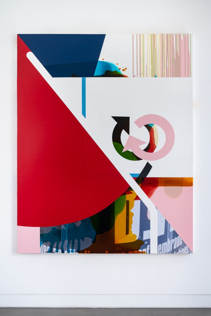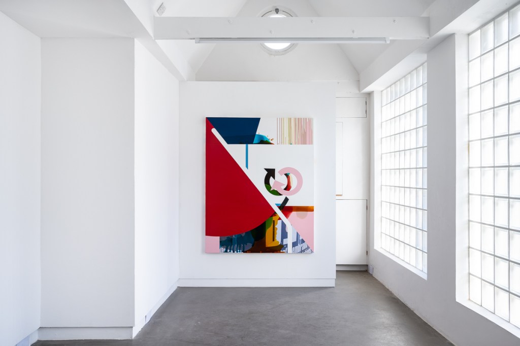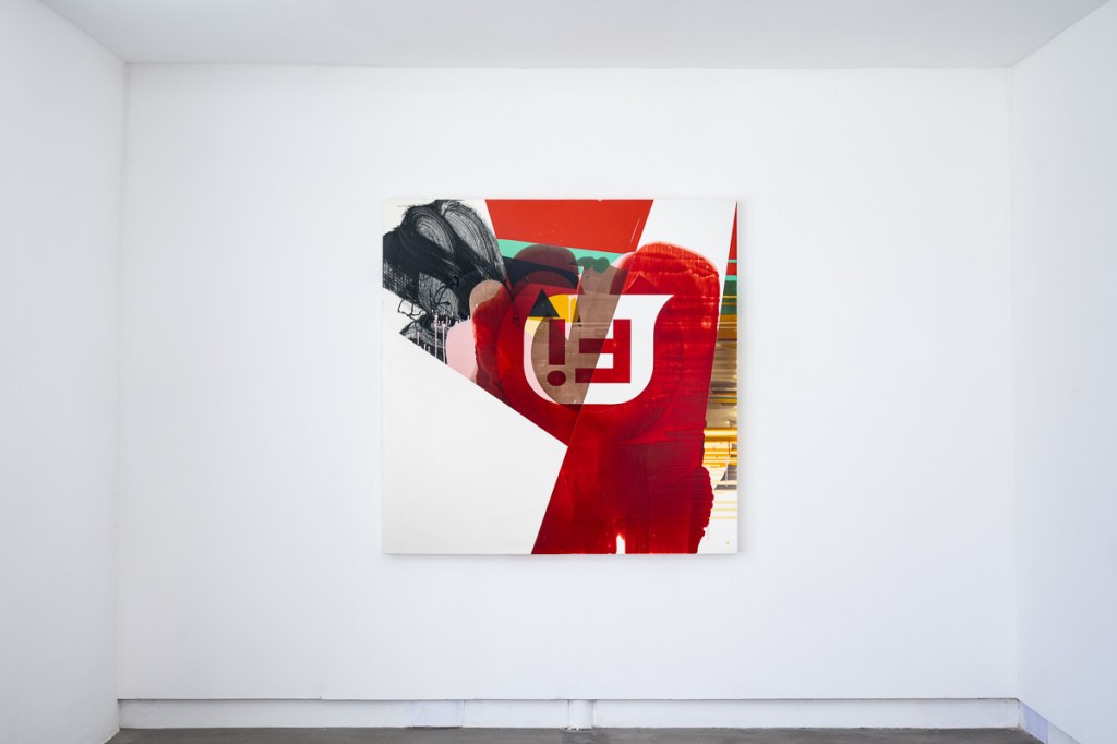 Stubbs’ recent paintings use repeated pouring in conjunction with masking, to collage together a condensed crowd of visual events. Scything blocks of colour collide with fluid transparent veils and remnants of stylized information. Transitioning through a succession of states, each painting compresses its elements to a point where their fragments become co-dependent. In this way the paintings work through a series of impulses, riffs, accidents, false starts and changes of mind, to arrive at a moment of dynamic complexity that can’t be planned. The visible shards of signage in the paintings refer the viewer to a digital realm that flows restlessly and centrifugally. This vocabulary is extended in the newer works through the incorporation of photo images into the picture plane. These images – taken in the studio, showing working materials and painting detritus – evoke a practice figured as a process of consumption and production. The works on show extend Stubbs’ painting idiom of simultaneous accident and deliberation, code and mark, excess and synthesis.